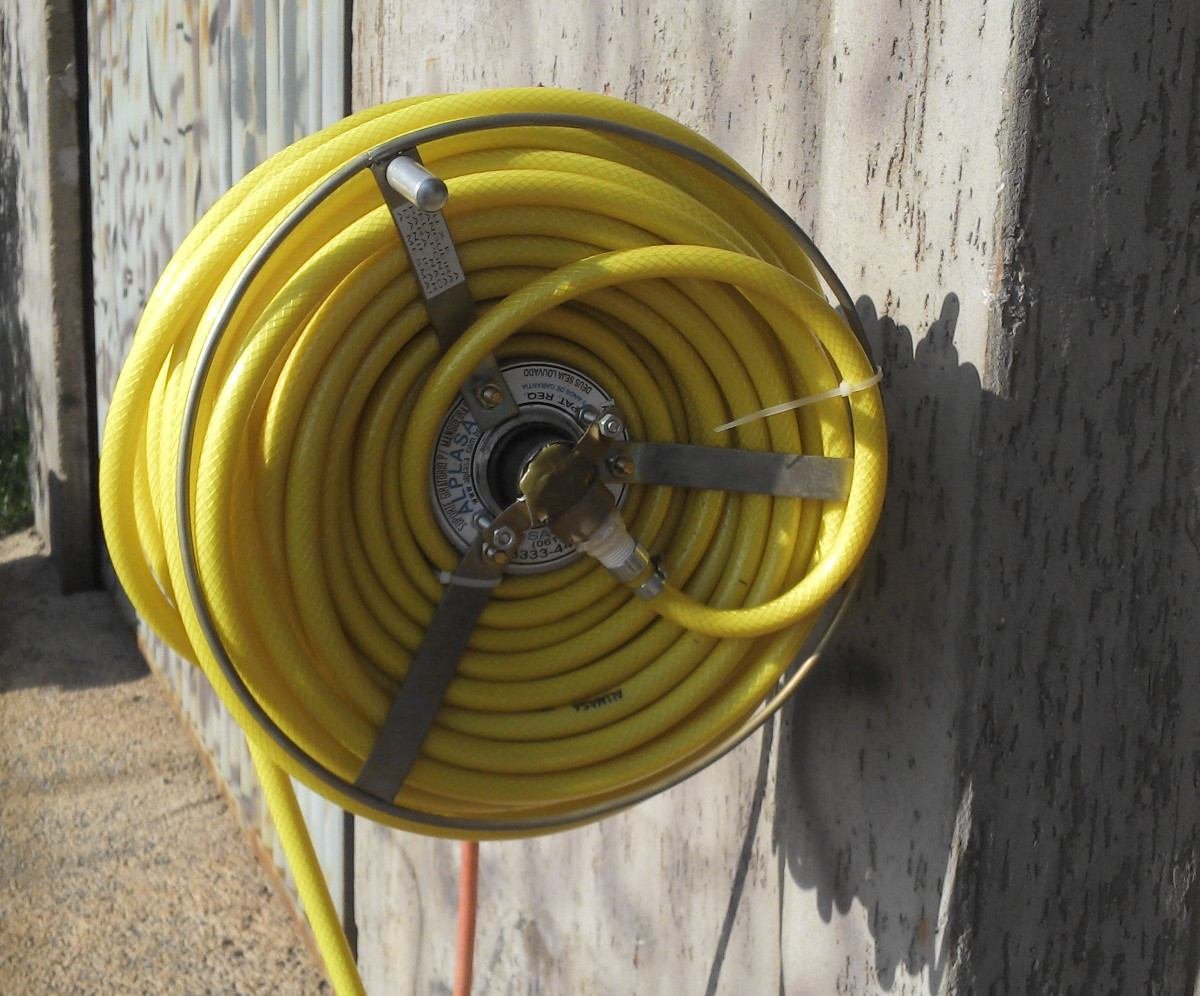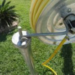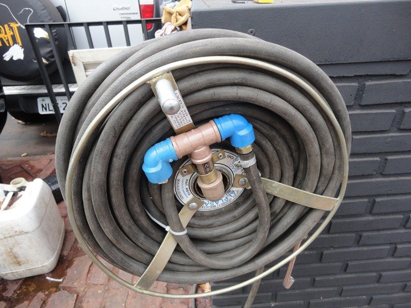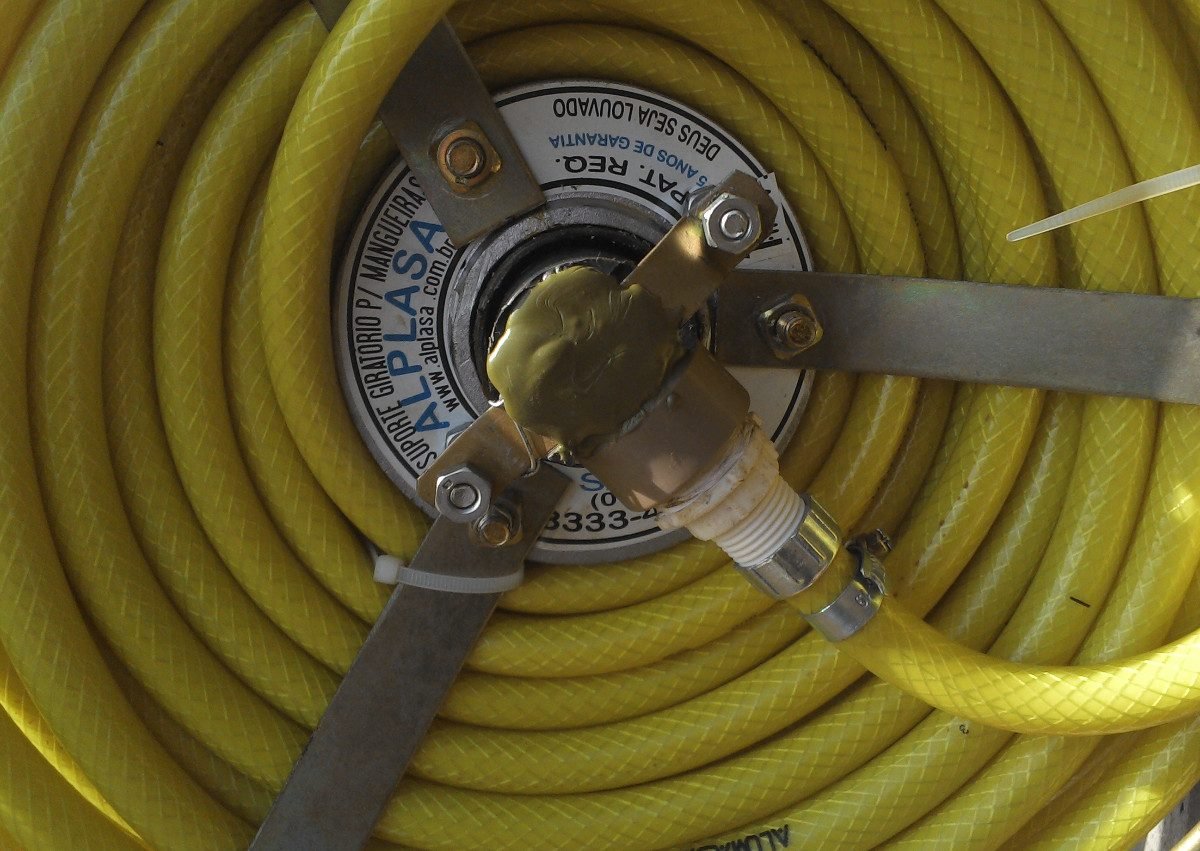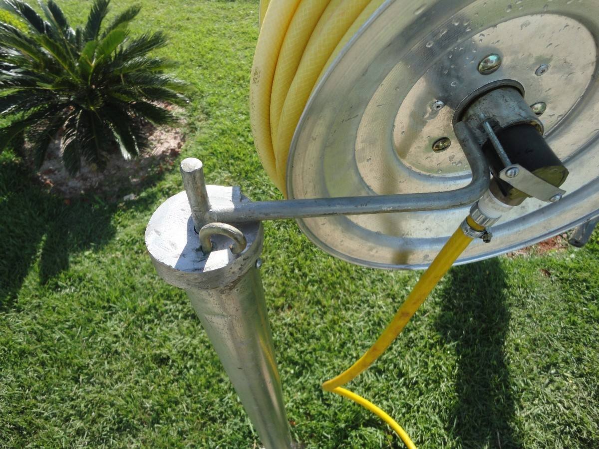 Suporte para mangueira com sistema de passagem de água todo em PVC soldável com lubrificação automática e garantia de 5 anos contra vazamentos, trabalha paralelo e perpendicularmente a base, em alumínio para aumentar a durabilidade em locais que sofrem com a ação da maresia e com capacidade de até 30 metros de mangueira de 1/2″.