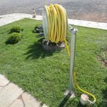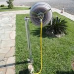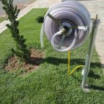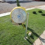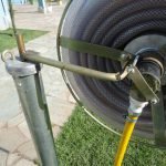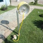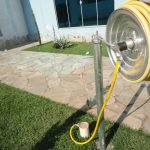 Suporte para mangueira com sistema de passagem de água todo em PVC soldável com lubrificação automática e garantia de 5 anos contra vazamentos, trabalha paralelo e perpendicularmente a base, galvanizado para aumentar a durabilidade e com capacidade de até 30 metros de mangueira de 1/2″.