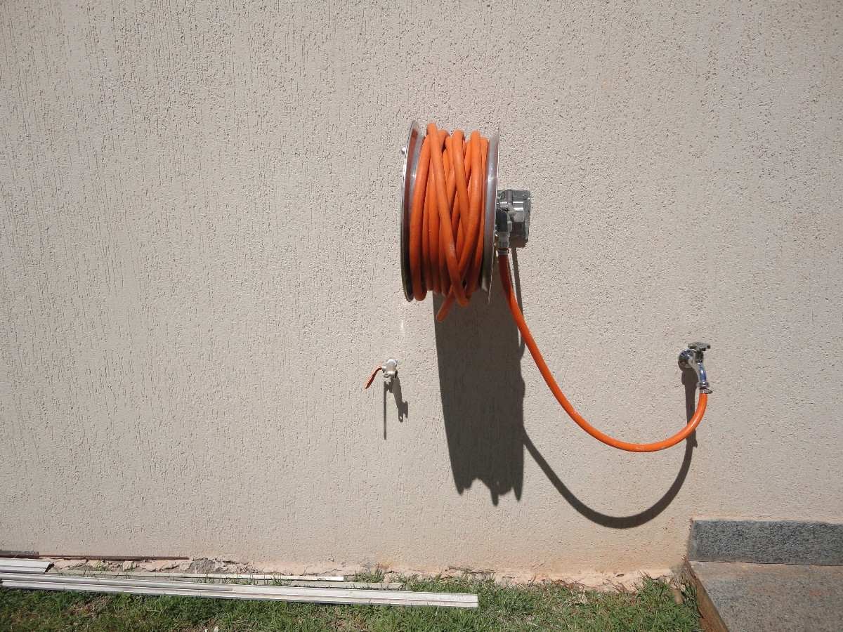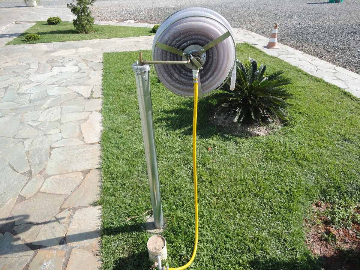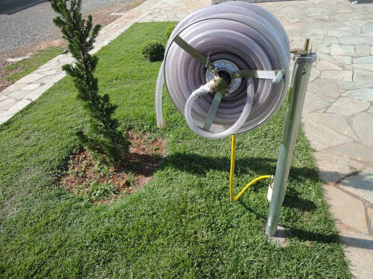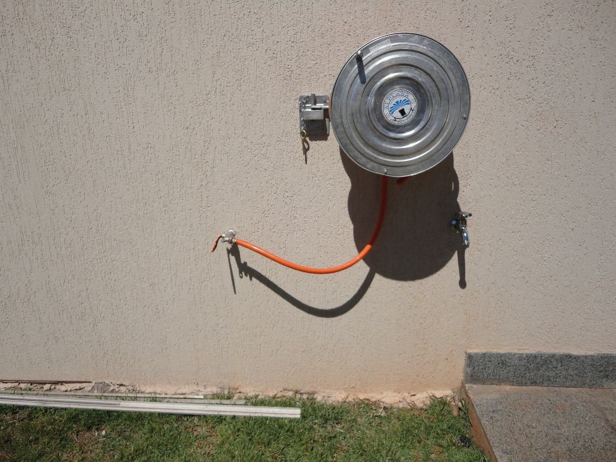 Sistema de passagem de água todo em PVC com 5 anos de garantia contra vazamentos. Organiza o local, conserva a mangueira e facilita o uso.